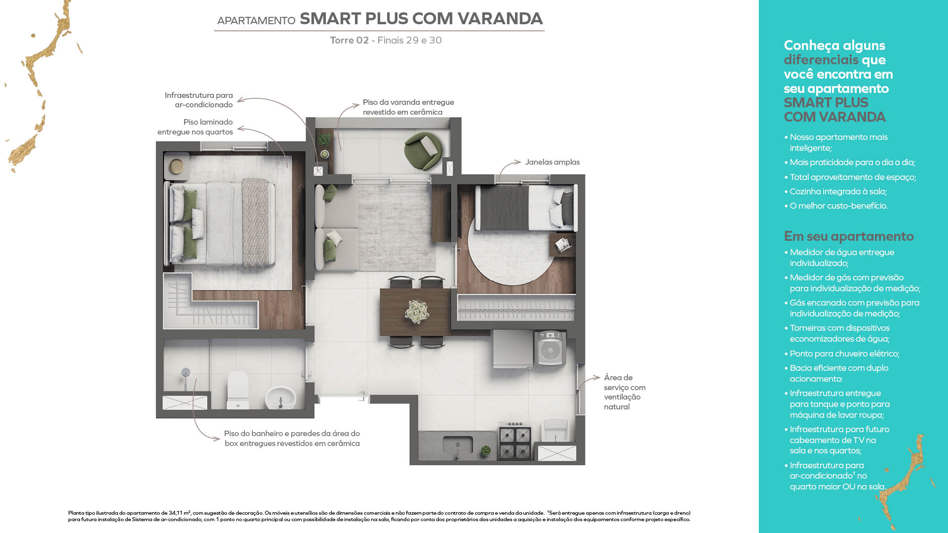 Academia, Espaço Funcional e Minimercado Infraestrutura para ar-condicionado no apartamento, Gás encanado no seu apartamento, Plantas com total aproveitamento do espaço Janelas amplas para mais luz natural e ventilação, Possibilidade de fechamento da varanda, Piso do terraço, banheiros e paredes do box revestidos de cerâmica, Piso laminado entregue instalado nos quartos, Previsão para cabeamento de TV na sala e quartos