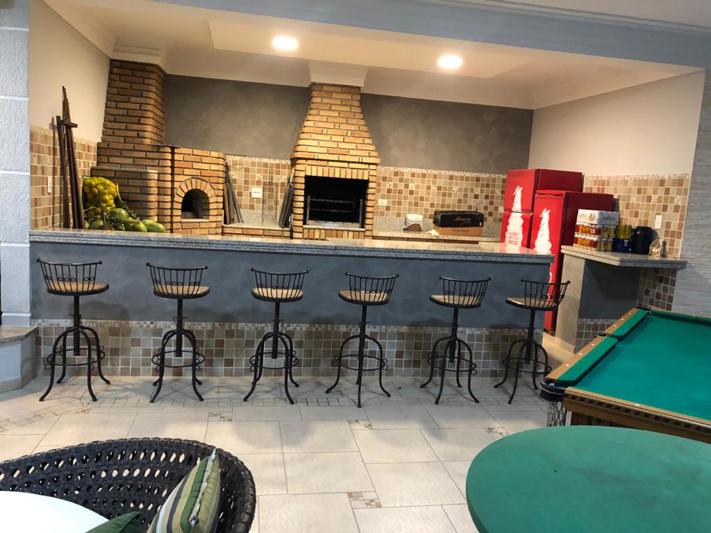 Living de entrada, sala de estar com lareira e pé direito duplo, jardim de inverno, lavabo, sala de TV, sala de jantar, escritório, cozinha planejada, área de serviço, amplo espaço gourmet completo com trio caipira, piscina com 103m² desenhada e com cascata, banheiro individual para atender área de lazer, lindo paisagismo externo, sala de ginástica, salão de jogos, 4 vagas cobertas + 4 descobertas, portão automático. Acabamentos finos.
