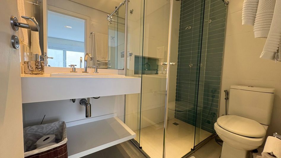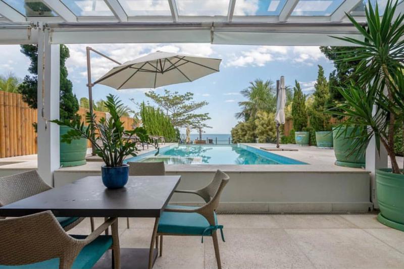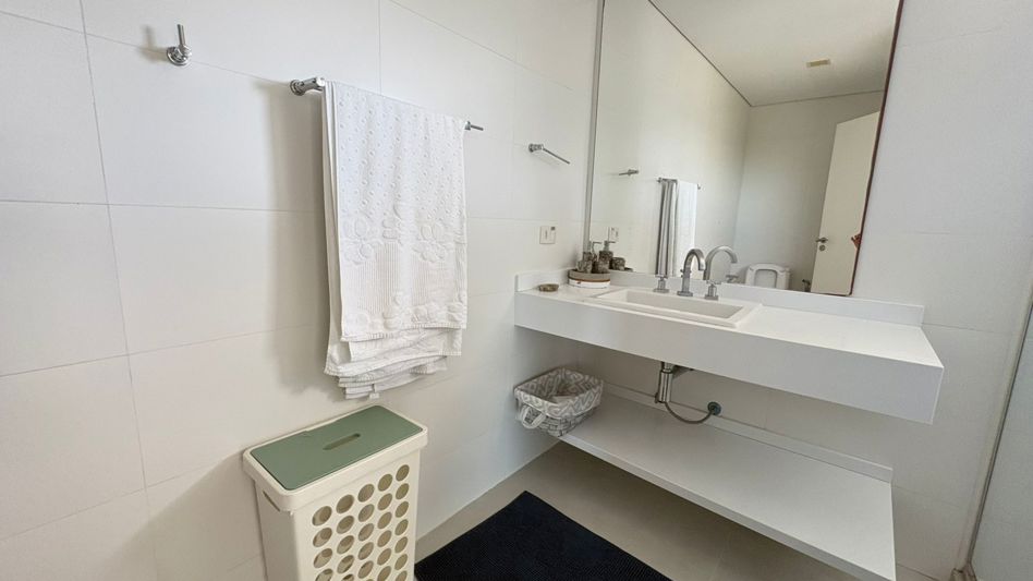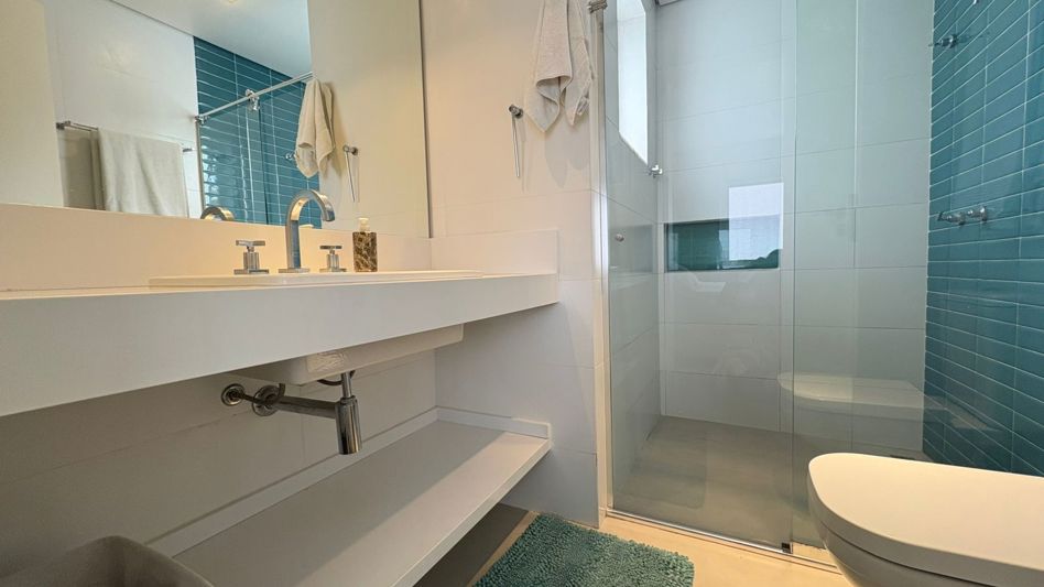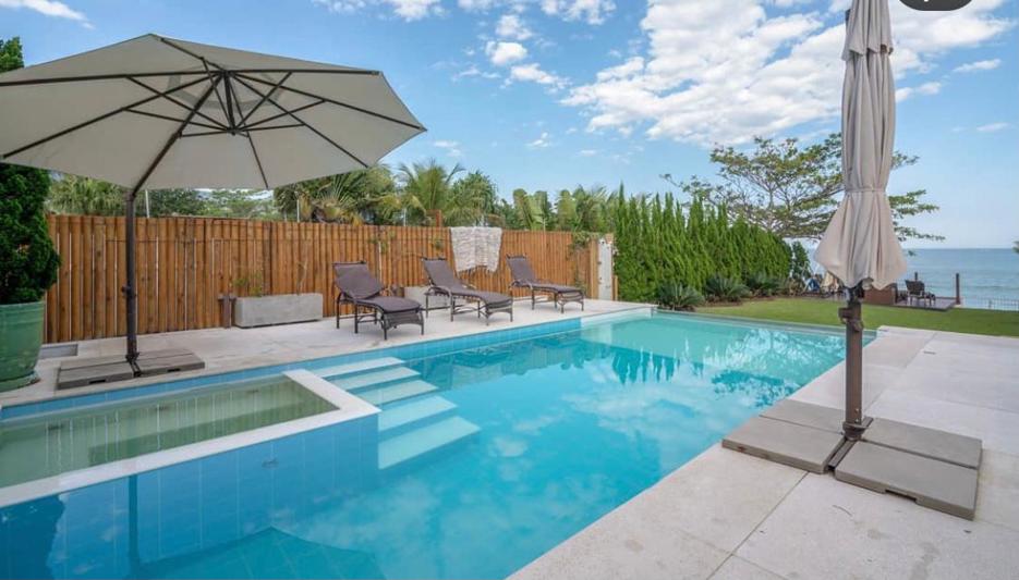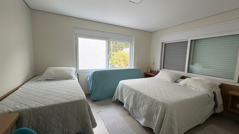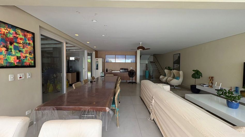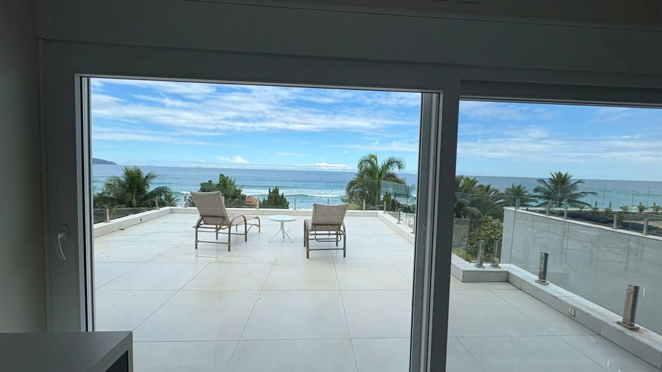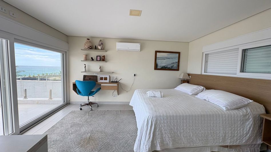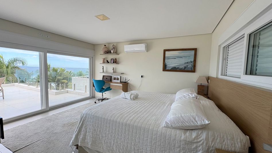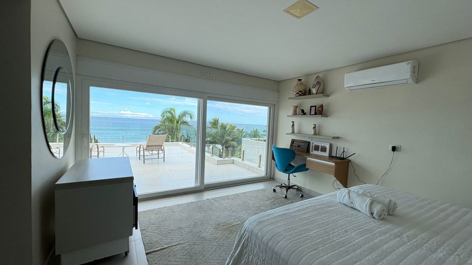 Casa pé na areia com 5 suítes, sendo 3 com vista para o mar e uma com terraço. Sala de estar, jantar, cozinha, churrasqueira, terraço e piscina aquecida com vista para o mar. Deck de frente para a praia. 3 vagas de garagem. Em condomínio fechado.
