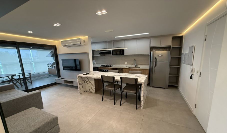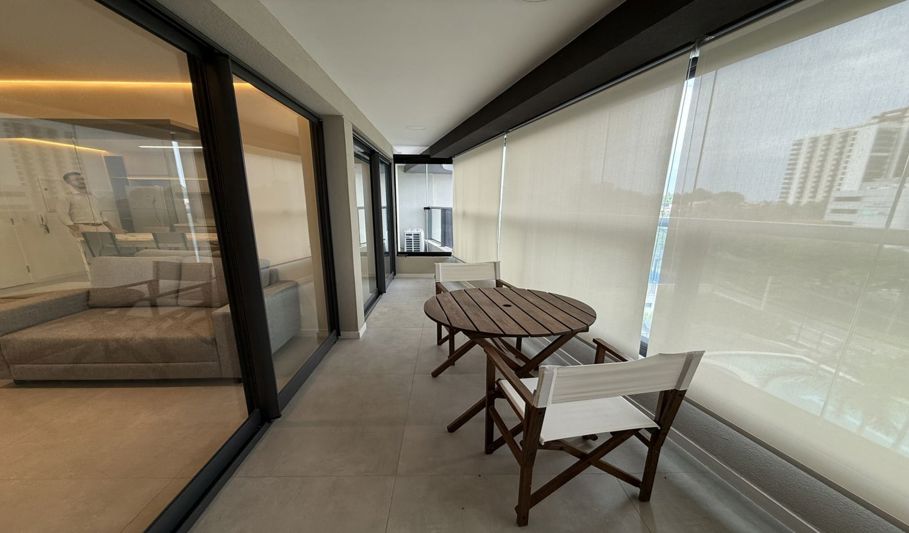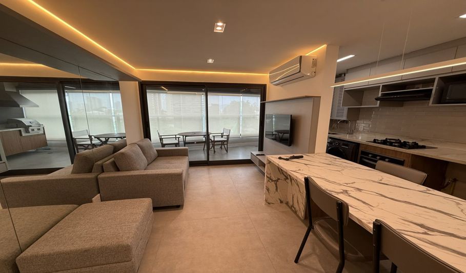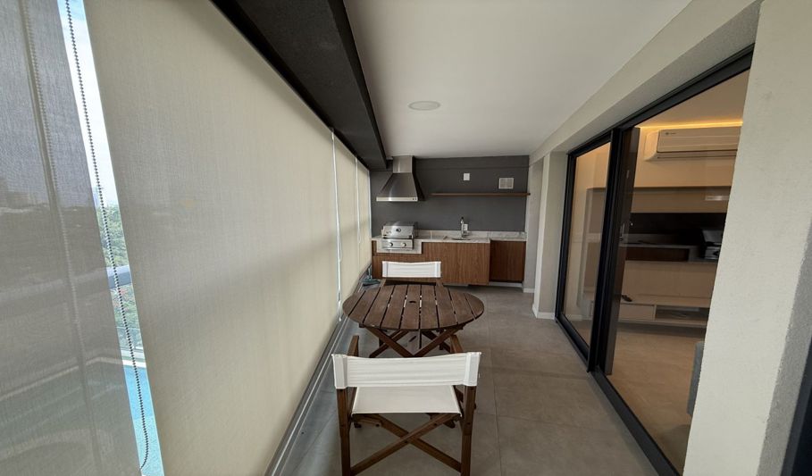 Na área externa, há piscina e espaço coberto para lazer.