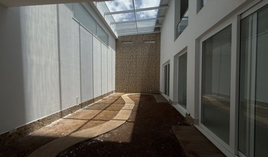 O jardim de inverno tem teto de vidro. A garagem comporta 10 carros, sendo 2 vagas cobertas e o restante descoberto, com espaço para manobras. Todos os cômodos têm infraestrutura para ar-condicionado e água quente proveniente de um boiler de 800 litros.