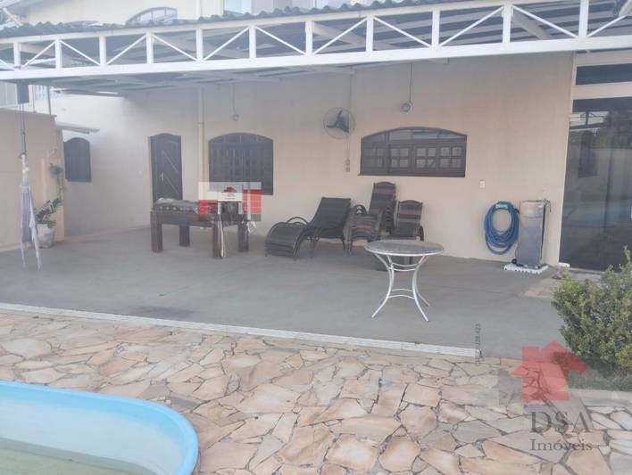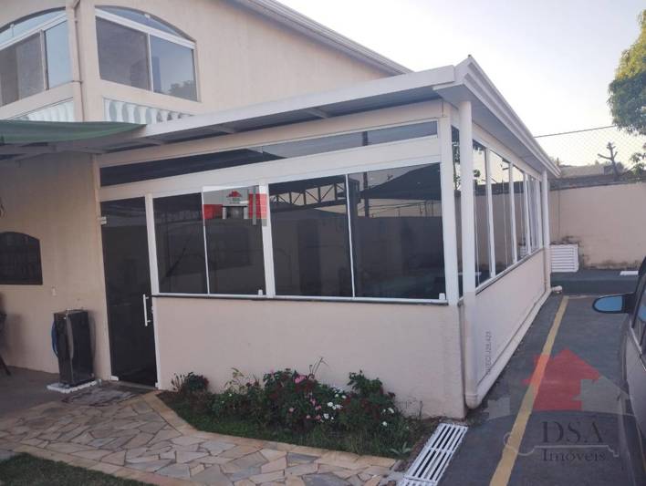Área gourmet com churrasqueira e banheiro, área de serviço, cobertura para guardar carros, piscina, jardim, portão fechado de correr.